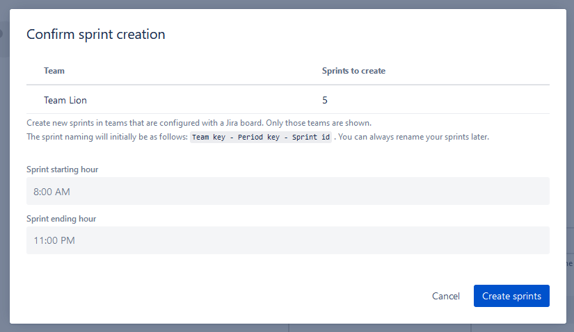 The sprint creation only works for [teams that are configured using a Jira board](https://docs.ativo.io/team#switch-between-jira-board-and-custom-team-configurations).