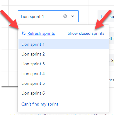 For teams configured in a custom way, sprints from Jira Scrum boards that have a JQL filter which includes a reference to the projects used in the team are shown. Due to limitations in the Jira API, we cannot show other sprints.