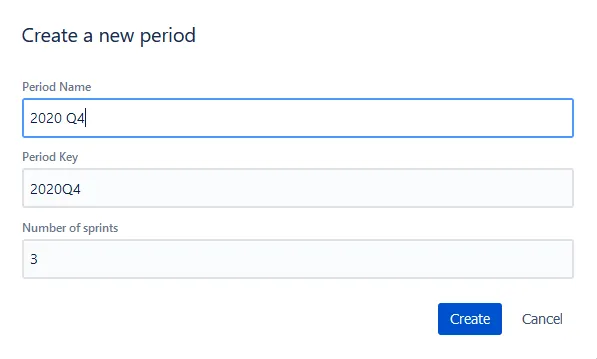 A period contains a set of sprints (iterations). Some organizations have one period per quarter (e.g. “2020 Quarter 4”).